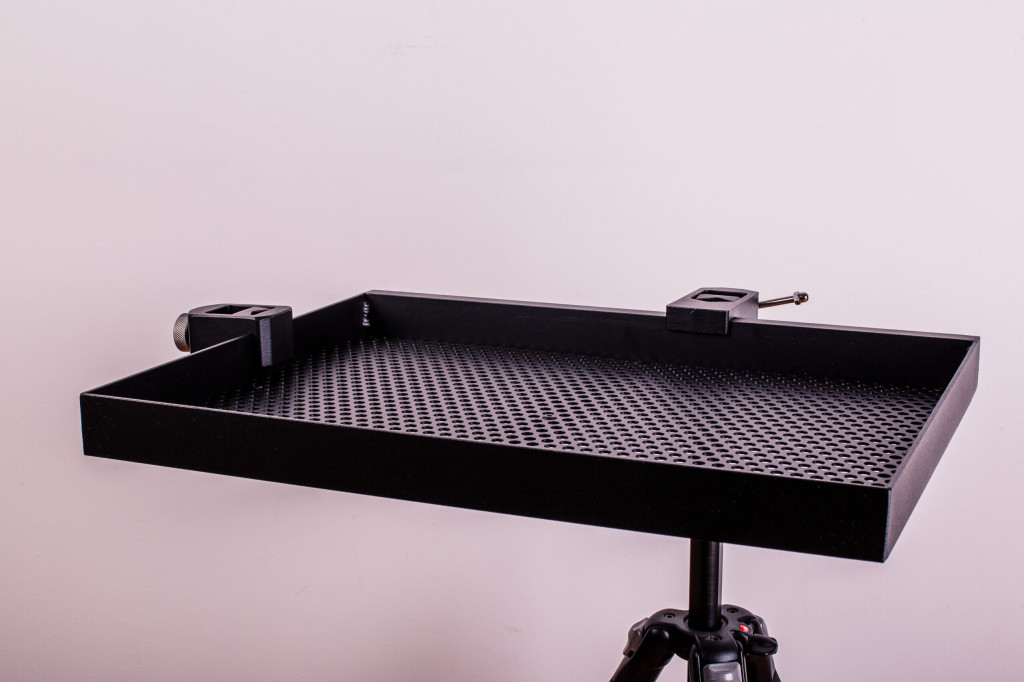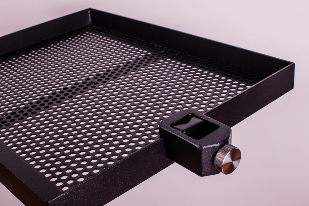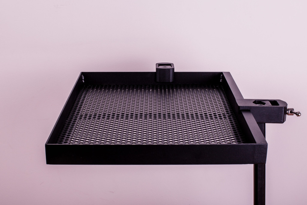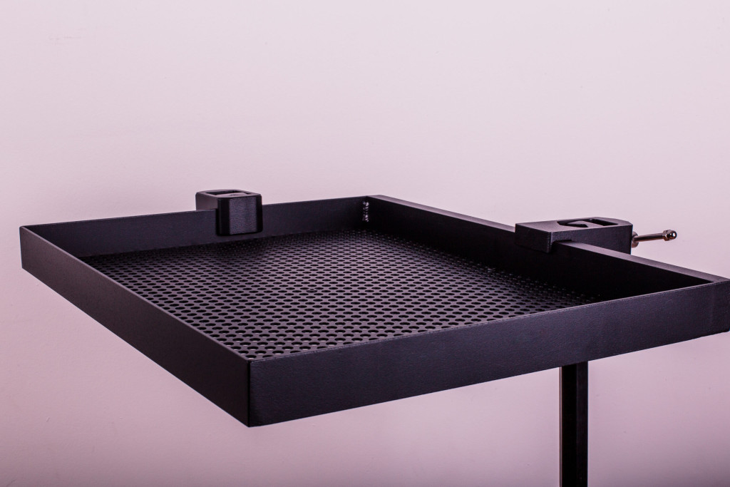 Kompakt, mégis tágas tálca. Csúsztatható tartóval, amely rögzíthető minden 25-36 mm átmérőjű lábra. Tartozéka egy kiegészítők rögzítésére alkalmas csúsztatható tálcaadapter. Anyaga alumínium és rozsdamentes acél. Porfestett bevonattal.